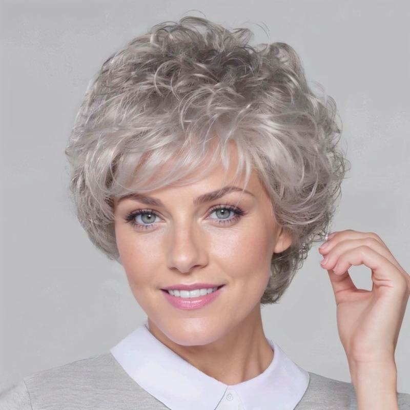 Women’s Short Curly Wig with Side Bangs Fluffy Gray-White Heat-resistant Synthetic Hairpiece