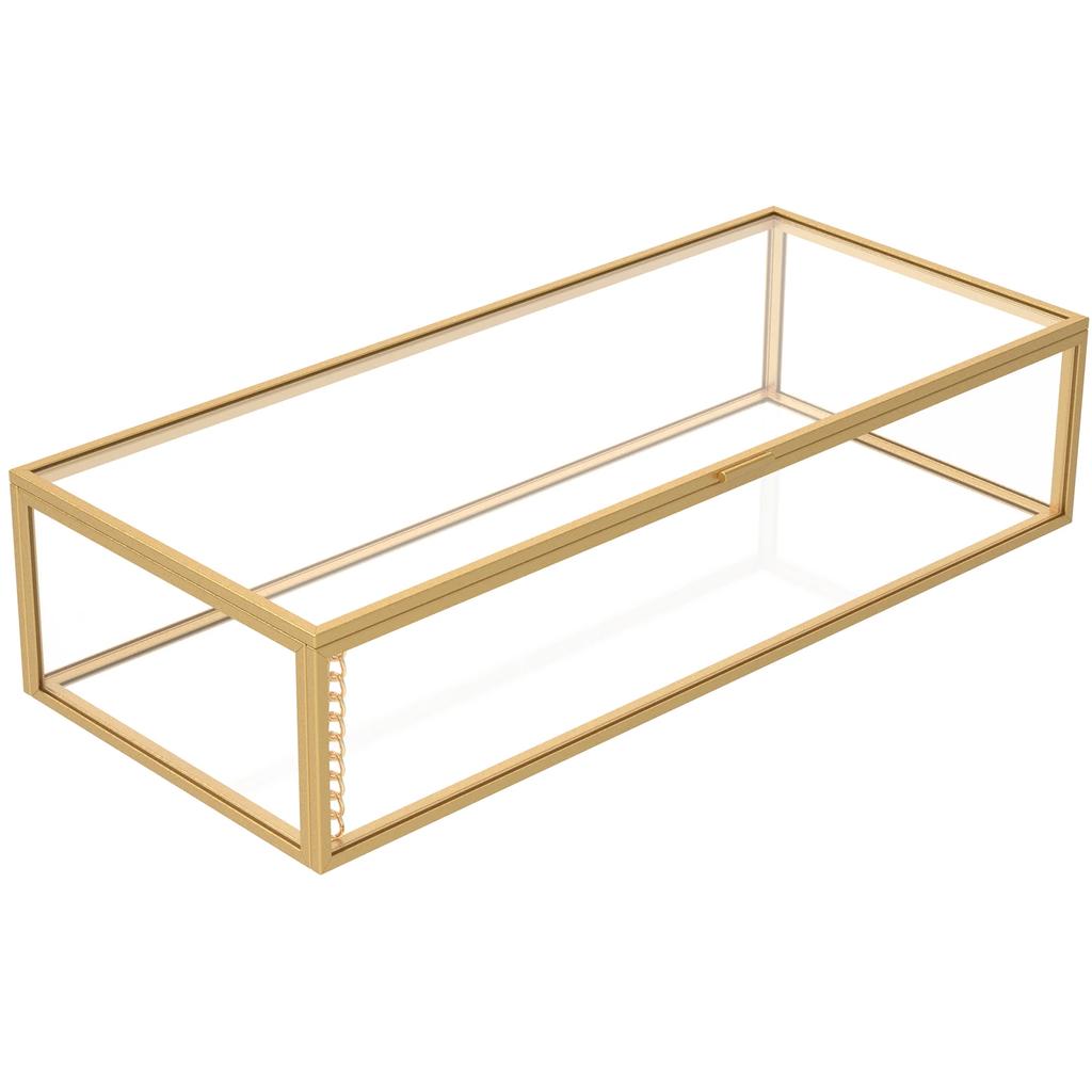 Glass Jewelry Box Vintage Jewelry Organizer Box with Hinged Lid and Mirrored Bottom Transparent Desktop Decorative Golden