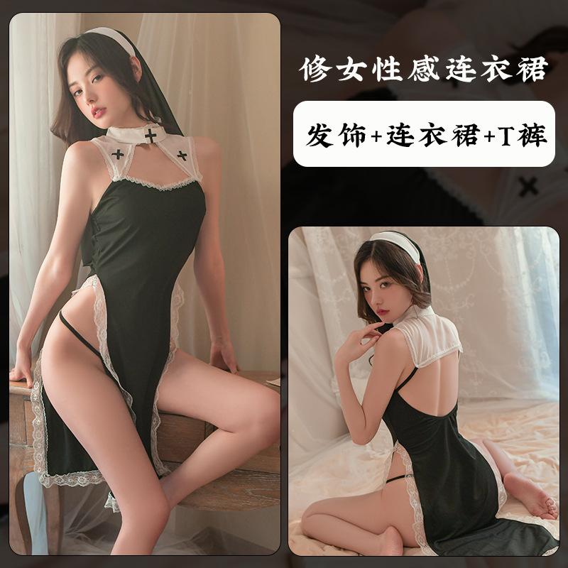 Sexy lingerie nun suit hot hollowed-out seduction high split skirt cosplay 524