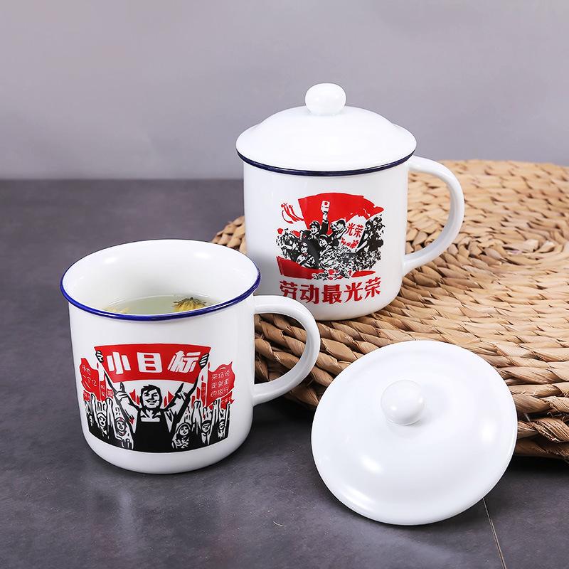 Ceramic mug with lid retro water cup office creative nostalgic classic imitation enamel cup