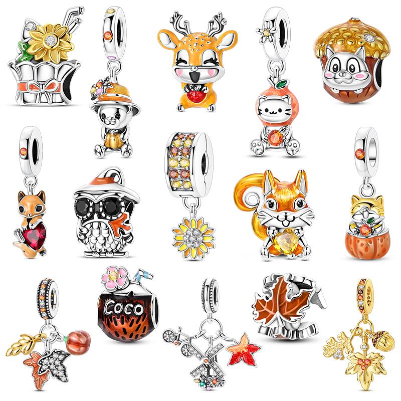 925 Silver Autumn Charms Beads Squirrel Deer Maple Leaves Pendant For Women DIY Jewelry Bracelet