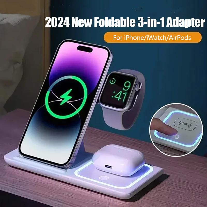 3 In 1 Wireless Charger LED Light Phone Holder Stand For iPhone 15 14 13 12 iWatch 8 7 6 AirPods Foldable Fast Charging Station