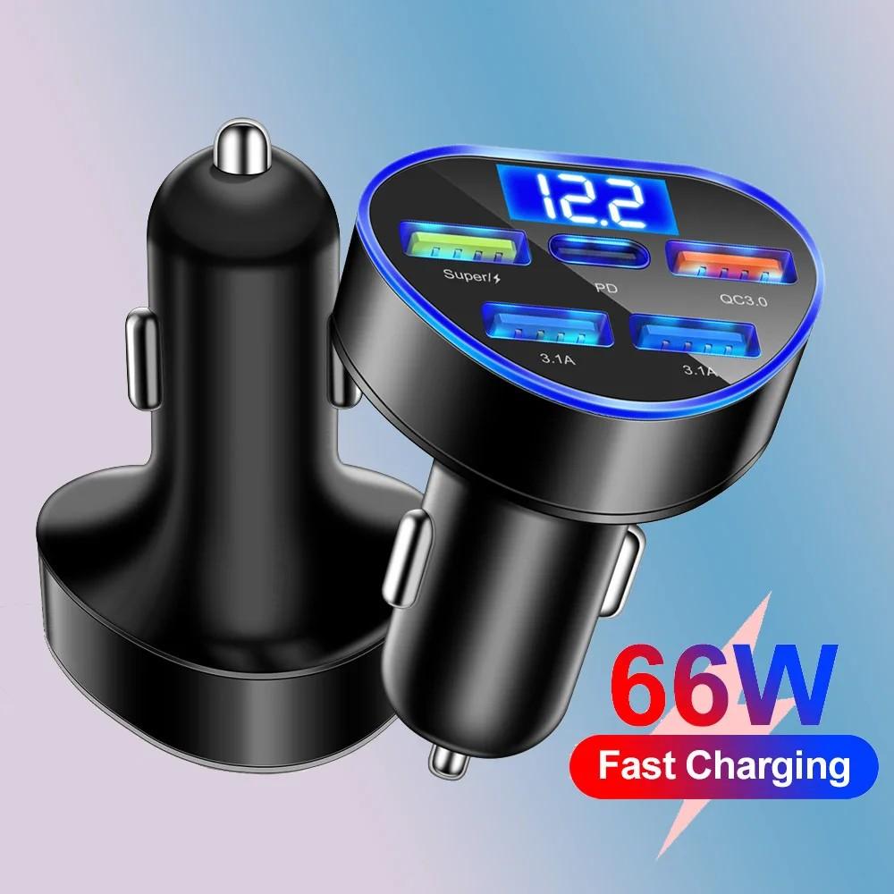 66W PD Car Charger QC3.0 Fast Charging Car Cigarette Lighter Plug 5 Port Car Charger Flash Charge with Digital Display