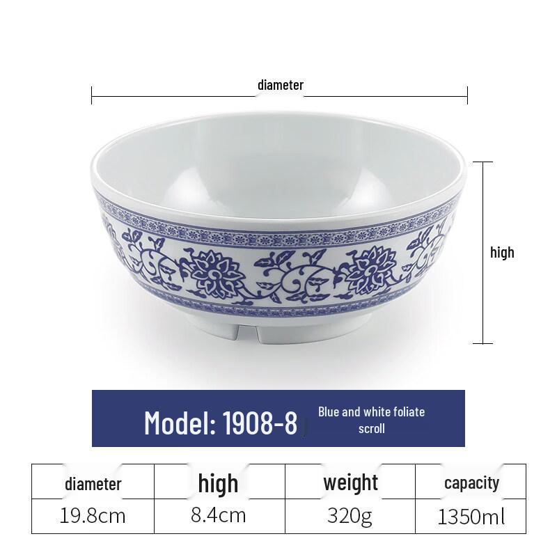 Melamine Blue & White Porcelain Ramen Bowl