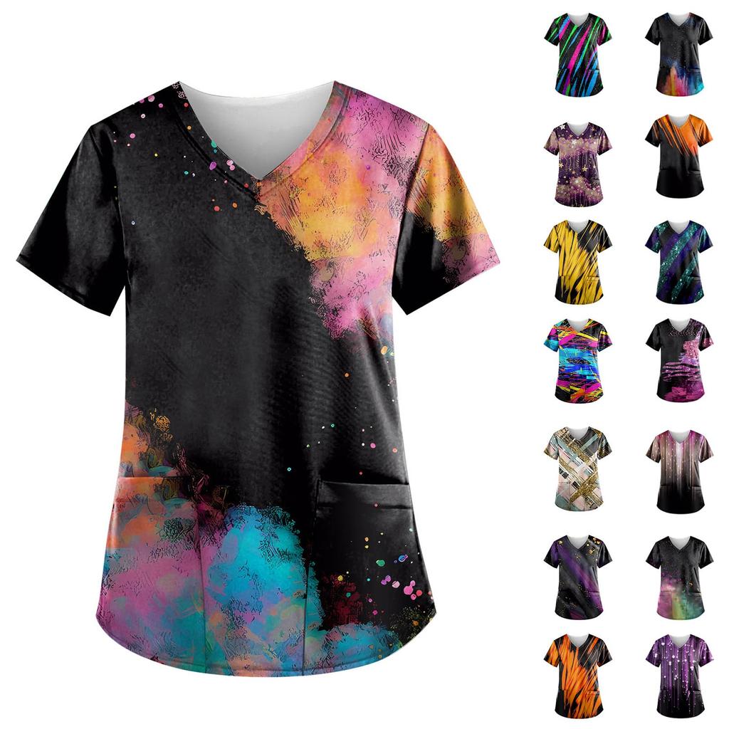 Ladies Casual V-Neck Plus Size Printed T-Shirt Workwear With Pockets