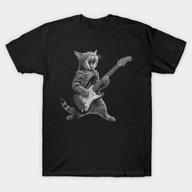 Men Black Print T-shirt Vintage Cat Playing Guitar Rock Star Rock And Roll For Men Women Kid No-Cut Transfer Paper Print Cotton Tshirt