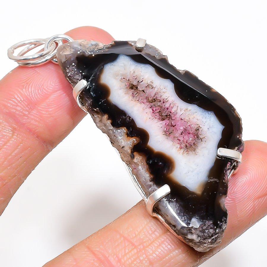 Pandantiv Bijuterie din Argint Sterling 925, Felie Geodă de Agat Natural 2,68" AP-14018