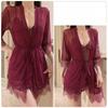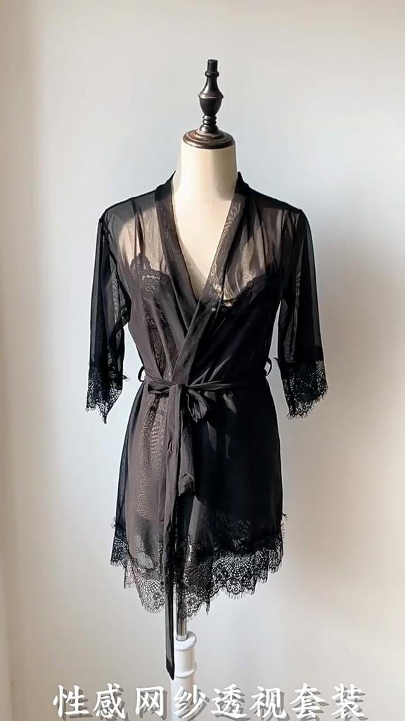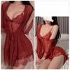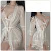 Set Lenjerie de Noapte Sexy Transparentă din Plasă pentru Femei Dulce Rochie Cami cu Fundiță din Dantelă cu Halat și Tanga