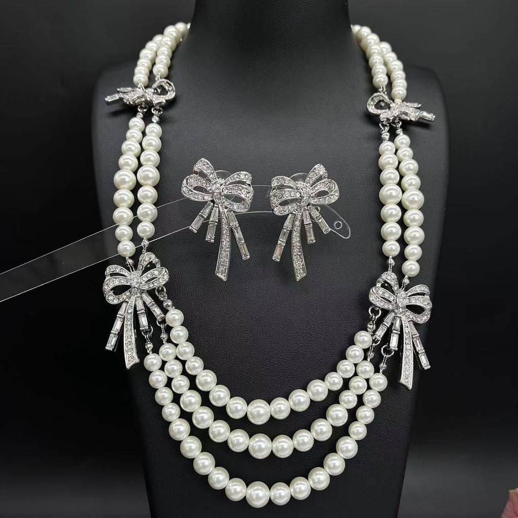 Medieval vintage vintage bow pearl necklace court style niche temperament multi-layer chain collarbone chain necklace