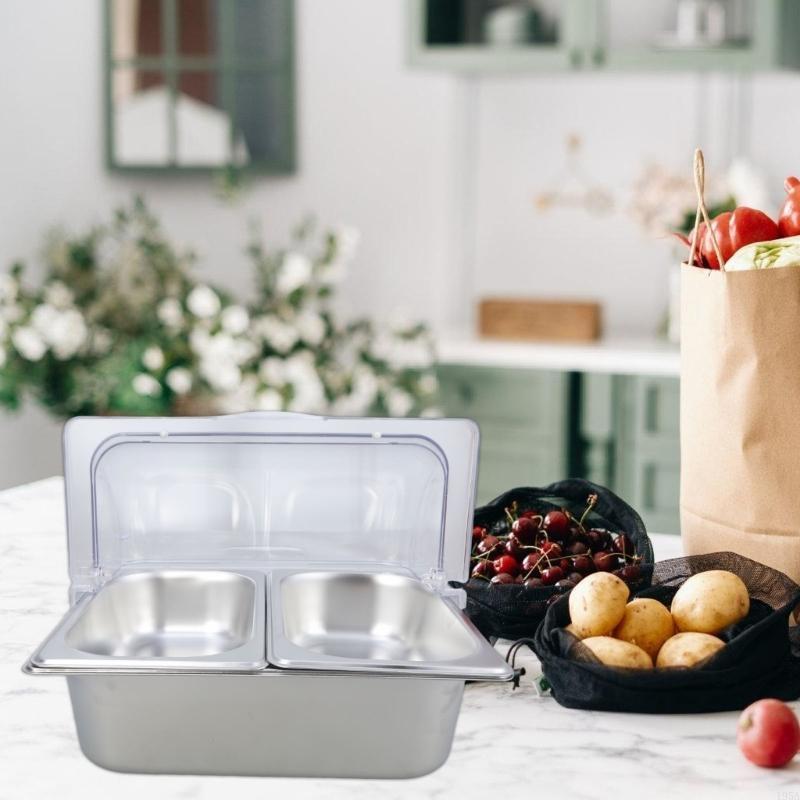 Stainless Steel 2 Compartment Buffet Tray with Clear Roll Top Lid for Restaurant Condiment Dispenser Food Display Pan