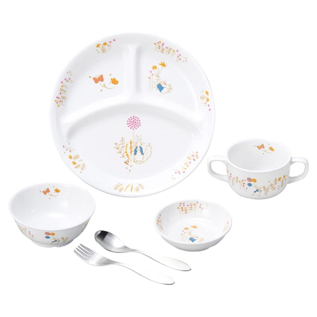 [PETER RABBIT, the hero of a story that has been loved by people around the world for over 100 years] "Adventure" features a warm orange base and an adorable design of Peter Rabbit exploring the fields. It comes with a child's spoon and fork, making it a wonderful gift set. It comes in a special presentation box embossed with the Peter Rabbit logo. Since this product is hard to find in stores, it makes a wonderful gift for a special someone, such as a baby's first meal or a baby shower. Choose from five designs: Dot Girls, Fleur, Adventure, Natural Garden, and Classic.