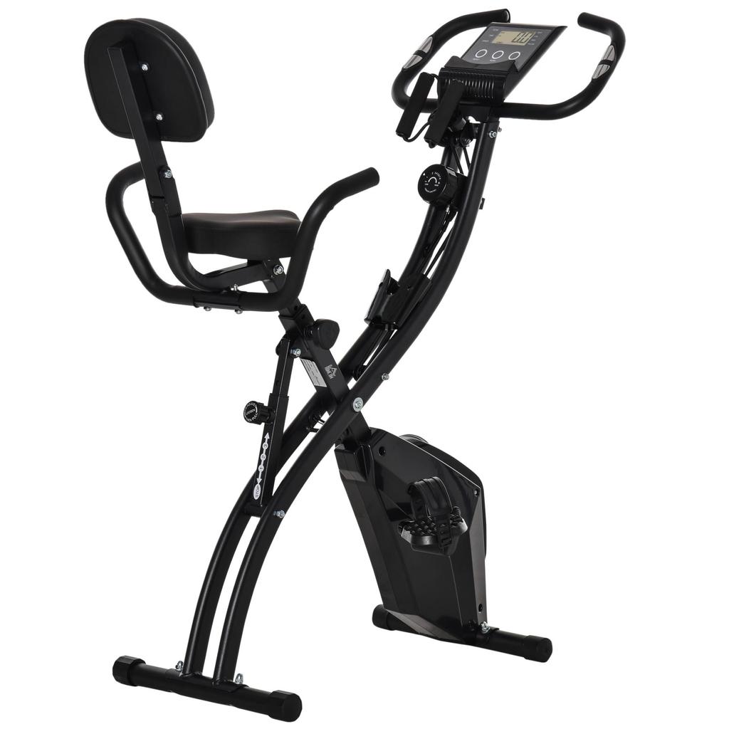 Foldable exercise bike with X-shaped frame adjustable in 4 levels to save storage space when not in use and 2 built-in casters for easy movement.