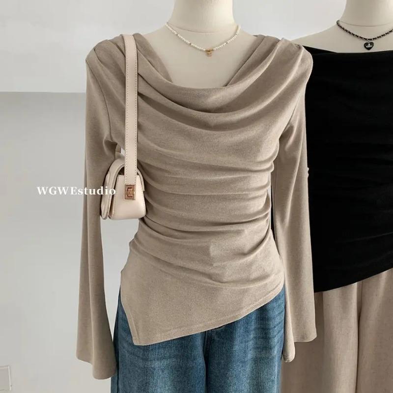 Tricou cu design de nișă, guler neregulat tip leagăn, cu mânecă lungă, nou pentru toamnă, pentru femei, top slim pe un umăr pentru femei