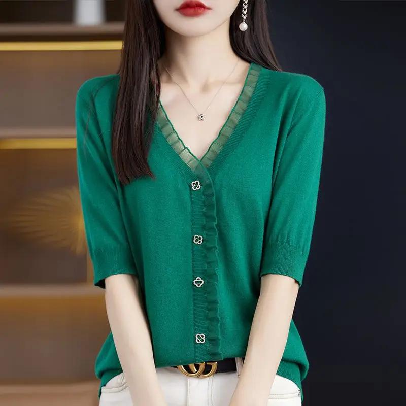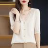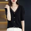 Women's White V-Neck Knit Cardigan Half Sleeve Button Up Casual Slim Fit Top
