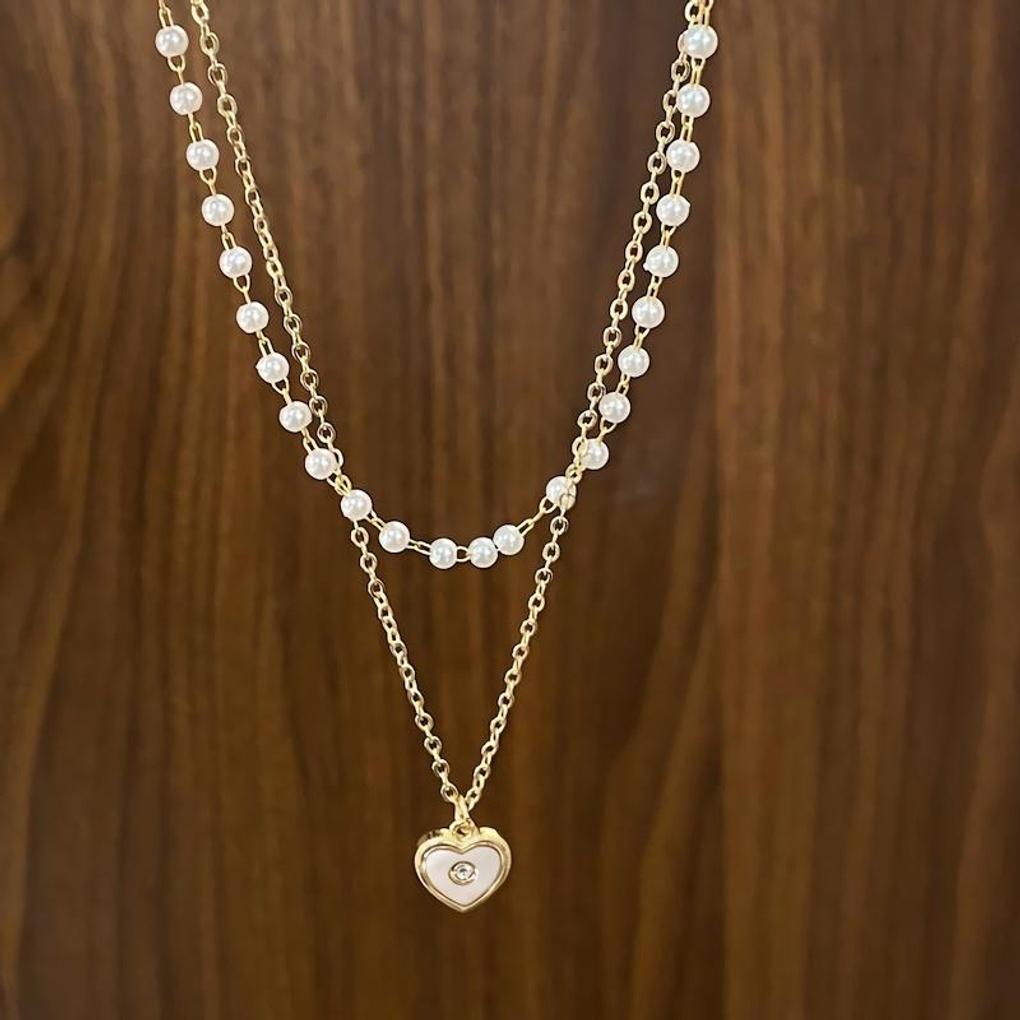 Women's Pearl Beaded Mother-of-Pearl Heart Double-Layered Necklace
