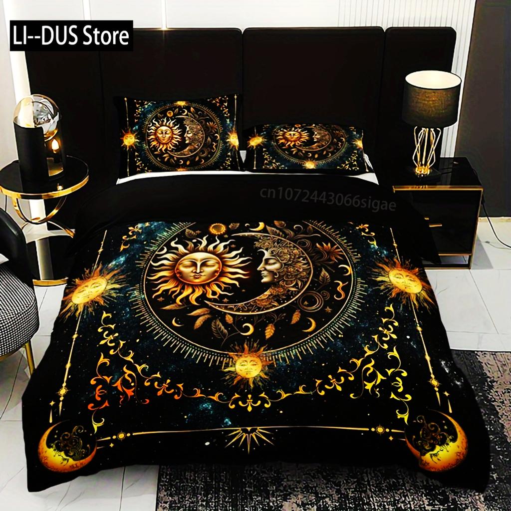 Celestial Digital Printed Bedding Set Son Moon Duvet Cover Set Breathable Fabric Golden Astrological Design King Queen Twin Size