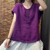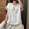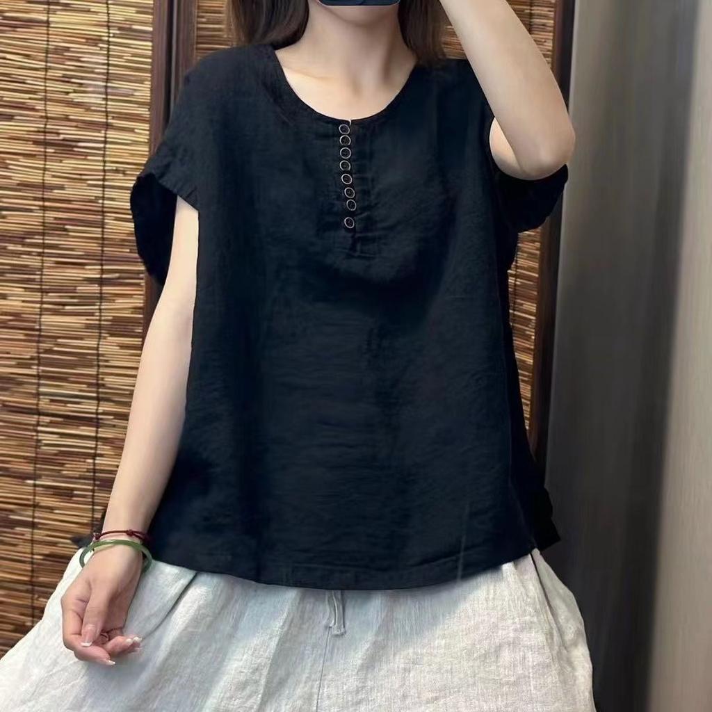 New Hot Season Style Literary Vintage High-end Solid Color Cotton and Linen Top for Women Loose Round Neck Casual Simple Short-sleeved Pullover