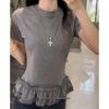 Ballet Style White Round Neck Short-sleeved For Women T-shirt Summer Pure Desire Wood Ears Front Shoulder Fitted Top