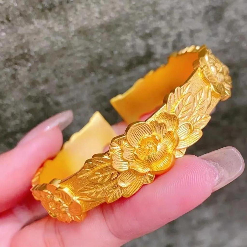 Golden Ancient-Style Peony Carved Open Bangle - Double Happiness Wedding Bracelet