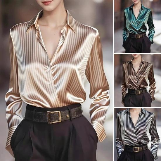 Cămașa de damă este confecționată din poliester de înaltă calitate, oferind respirabilitate și o senzație moale, prietenoasă cu pielea, pentru confort pe tot parcursul zilei.. Prezentând un guler unic, o croială lejeră și un model elegant în dungi, combină moda și eleganța fără efort..