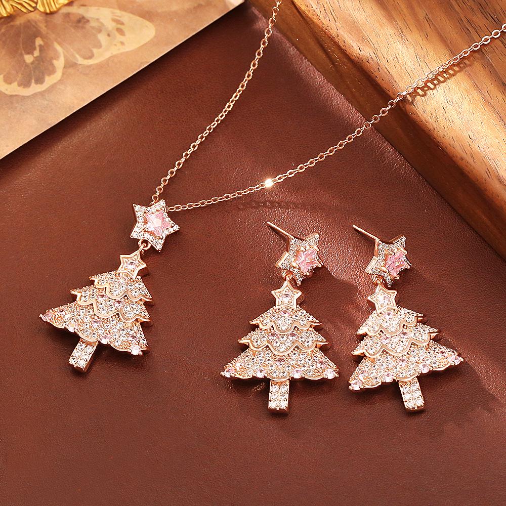 Hot-Selling Pink Zircon Pendant Necklace & Super Shiny Fairy-Style Earrings Set - Cute, Fresh Christmas Tree Design