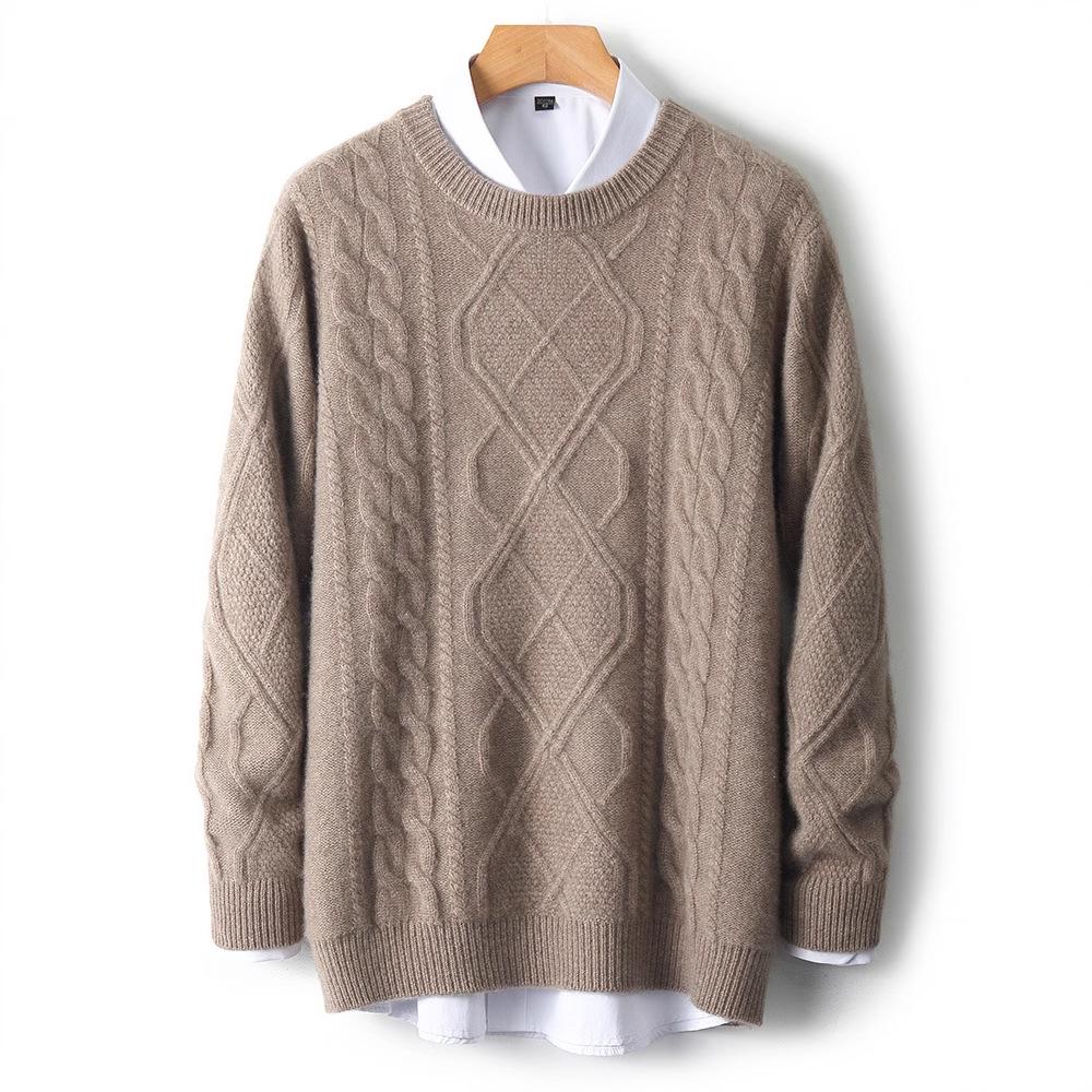 This men's sweater combines style and comfort, featuring a loose fit for a relaxed and easy-going look. Made from 100% wool, it offers warmth and coziness for cooler days. The sweater showcases an intricate five-needle large diamond jacquard knit design, adding a touch of sophistication to its casual appeal. With its round neckline and long sleeves, this sweater is a perfect choice for layering or wearing on its own.