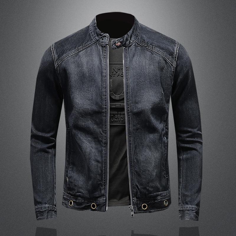 Spring 2020 Men's Dark Blue Retro Motorcycle Denim Jacket with Stand Collar and Zipper
