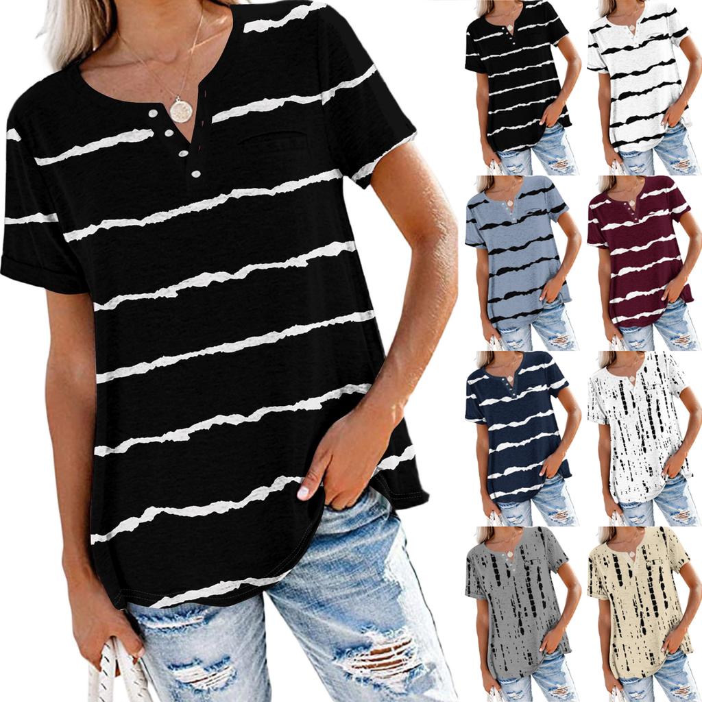 Women's Fashionable Casual Summer Striped V-neck Button Short-sleeved Top