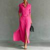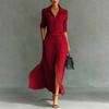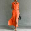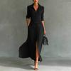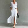 Women's Fashionable Color Lapel Long Sleeved Hem Slit Casual Shirt Dress