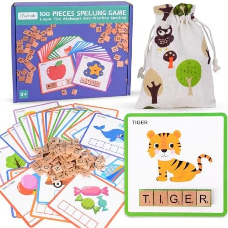Montessori Alphabet Learning Toy Set for Kids Ages 3-7, Spelling Game with 100 Wooden Letters, 30 Double-Sided Cards & Storage Bag, Educational Gift
