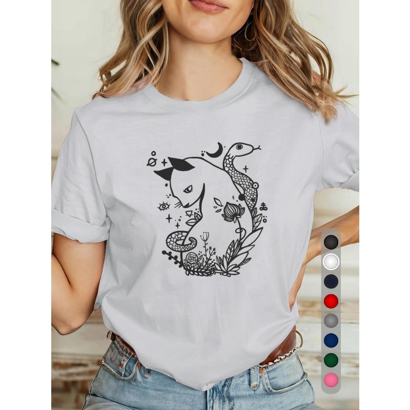 Women Bohemian Gothic Round Neck Short Sleeve T-Shirt Black White Mystical Cat Snake Floral Crescent Moon Print Machine Washable All-Season