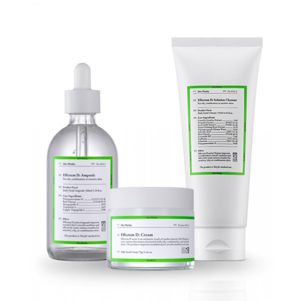 Effectum D Cleanser: Purified water, sodium cocoylalaninate, glycerin, dipropylene glycol, coco-glucoside, acrylates/C10-30 alkyl acrylate crosspolymer, potassium cocoate, lauryl glucoside, kelp extract, nasturtium leaf extract, centella asiatica extract, fig extract, Indian mulberry extract, Indian mulberry extract, ivigod fruit extract, black soybean extract, green tea extract, apple extract, propolis extract Eggplant fruit extract, aloe vera flower extract, cedar leaf extract, lotus leaf extract, sugar elm root extract, zulmandrami seed extract, cacao seed extract, holly basil leaf extract, dusong fruit extract, royal jelly extract, turmeric root extract, camellia sinensis extract, tomato extract, ginseng extract, parmesan leaf extract, drumstick seed extract, kavakaba leaf/root/stem extract, ginseng fruit extract, gourd oil, corundum tree oil Mint oil, cypress water, hydrogenated lecithin, salicylic acid, polyglyceryl-10 laurate, butylene glycol, decylene glycol, disodium EDTA, fructooligosaccharide, fermentation filtrate, dextrin, beta-glucan, hydrolyzed hyaluronic acid, methylpropanediol, ceramide NP, Gluconolactone, raffinose, allantoin, capryloyl salicylic acid, maltodextrin, polyquaternium-51, 1,2-hexanediol, hydroxyacetophenone, ethylhexylglycerin, pentylene glycol