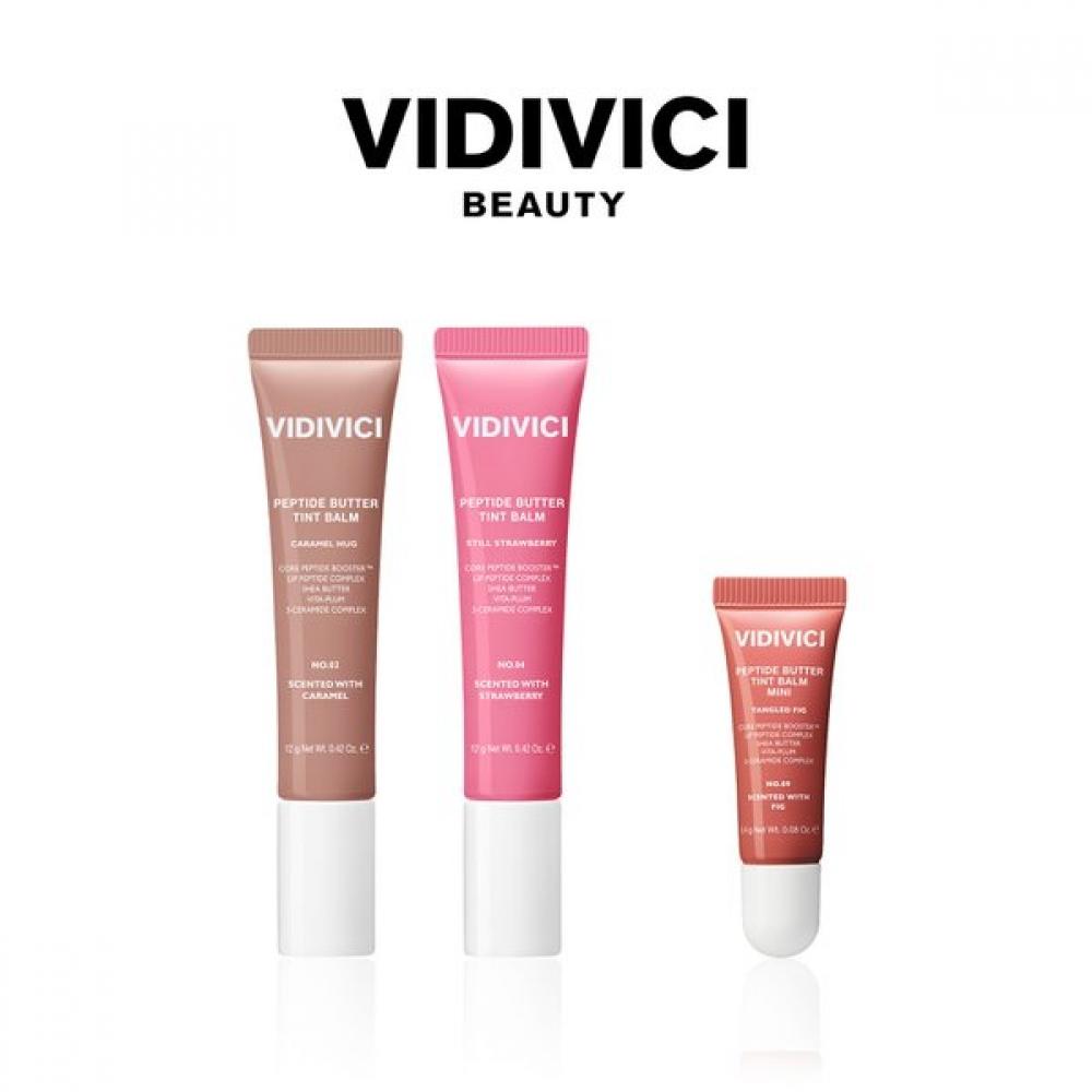 VidiVici Peptide Butter Tint Balm combines the pigment power of a tint and the moisturizing properties of a lip balm, characterized by its ability to melt into the lips and provide a moist glow. The peptide complex gently melts in, delivering 24-hour deep hydration and vibrant color. This product prevents dryness and flaking on lips during the winter, adhering smoothly for a shiny and plump lip.