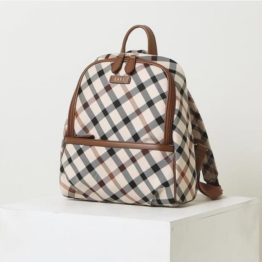 The DaX Brown House Check Backpack DCBA1E635W2 features a casual design emphasized by a check pattern adorned with logo decorations in harmonious colors. It incorporates high-quality cowhide with a soft touch for an additional style point. This product includes one external pocket, one internal pocket, and one back pocket for practical use.