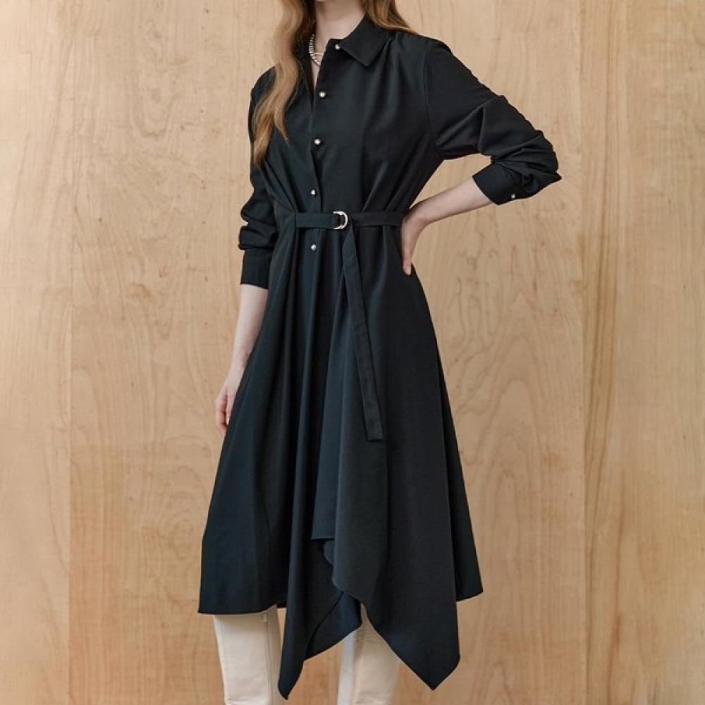 A shirt dress featuring an asymmetrical drape design. The waist belt allows you to adjust the silhouette, and pearl buttons add an elegant touch. Model wears: Black (Free size).