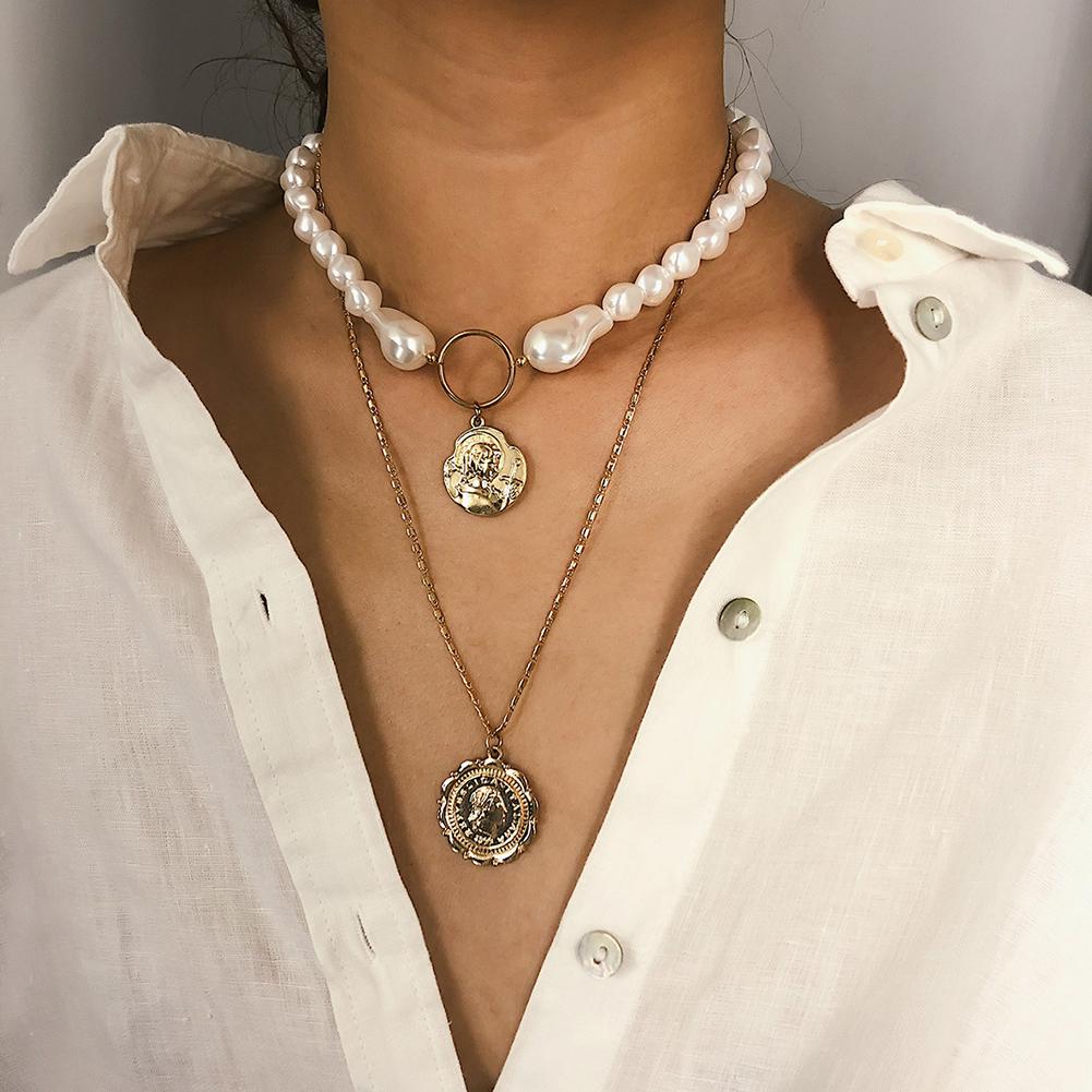 Woman Fashion Style Multi Layer Pearl Bead Retro Anaglyph Pendant Necklace