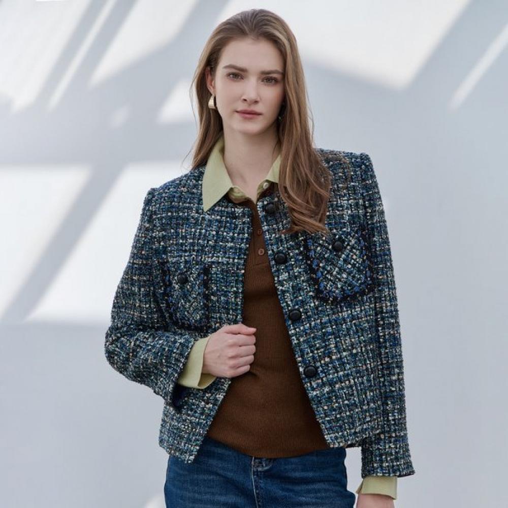 Majah's Glitter Mix Out Pocket No Collar Tweed Jacket is a wool blend tweed jacket that modernly interprets a sophisticated classic mood. The densely woven tweed texture creates a three-dimensional volume, and the addition of various toned threads provides a deep color. The button-decorated out pocket on the front and the intricate trimming finish along the edges maximize the classic details unique to tweed. The collarless design allows for easy matching with blouses, knitwear, and T-shirts, offering versatile styling options.