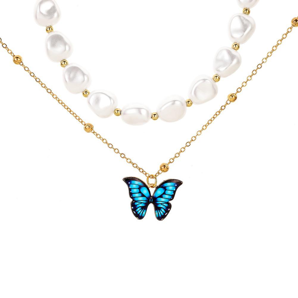 2 Pcs/set Women's Necklace Butterfly-shape Pendant All-match S Pearl Double-deck Necklace set