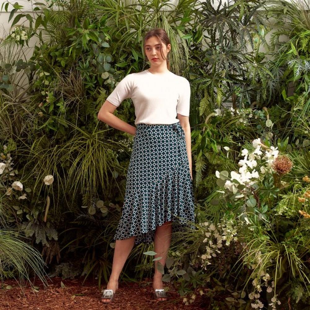 The Lipbbam Vivienne Frill Wrap Skirt (LDM57SG01) is categorized under women's business dresses and features a distinctive frill wrap design. This skirt is suitable for business wear and is a great item to match with various tops.
