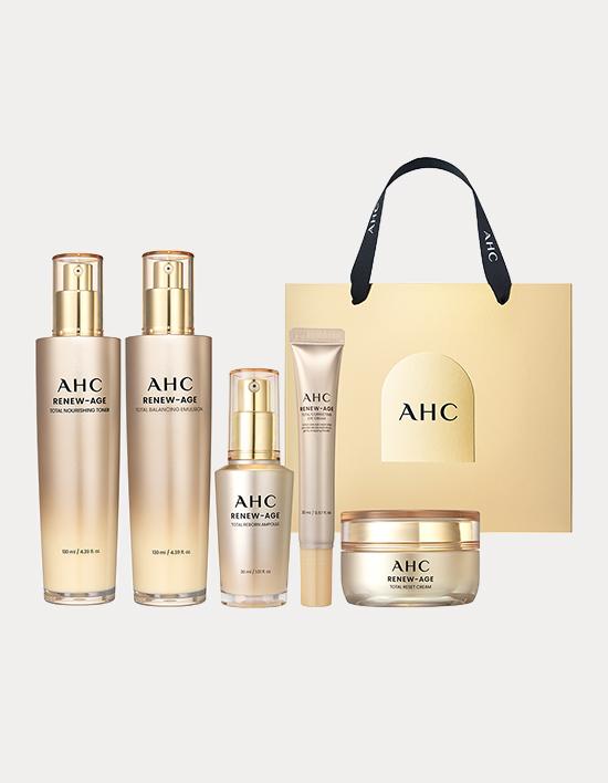 AHC Renew Age Total 4-Piece Gift Set is an anti-aging skincare set that restores firmness and radiance to the skin. This set includes toner, emulsion, ampoule, and cream, providing nutrition and elasticity to the skin at each step while assisting with wrinkles, hydration, lifting, and skin density improvement. It contains low molecular peptides that deeply absorb into the skin for effective elasticity improvement.