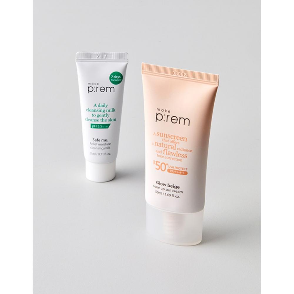 MAKEPREM Glow Beige Tone-Up Sun Cream 50ml is a hydrating mineral sunscreen suitable for combination to dry skin. This product offers a natural tone-up effect while providing hydration and a glowing appearance for a healthy skin tone. It effectively blocks UV rays while brightening the skin tone, minimizing the appearance of white cast with its beige tint for a more natural finish. It's well-received for its usability even for dry and oily skin, making it perfect for summer use.