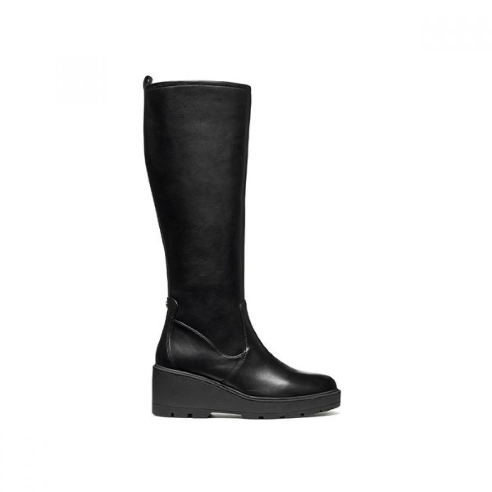 The Geox Women's Long Wedge Heel Boots Black Miareil 8GX3VC5W1B are lightweight cushion-design comfort long boots with anti-slip features. With a heel height of 6.5CM, they provide a stable wedge heel structure, and the ball part is made of comfortable cushioning, making them suitable for extended wear. This boot boasts warmth and a stylish design, perfect for the winter season.