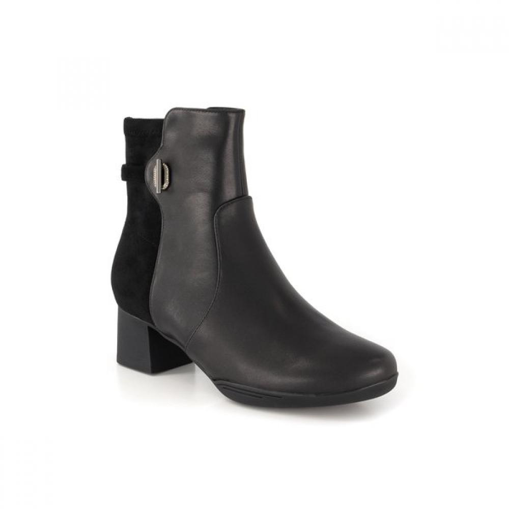 The Tandy Ankle Boot J1556 in black features a clean style for women's ankle boots, characterized by a sophisticated design that pairs well with skinny jeans, skirts, and pants. It enhances foot comfort with a cushioned molded sole and high heel while a flexible non-slip sole reduces foot fatigue.
