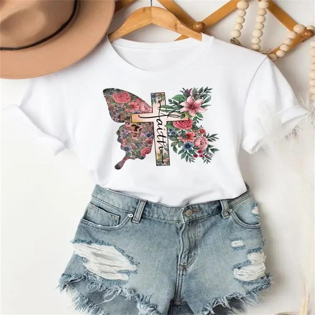 Casual Tee O-neck Women Graphic T-shirts Clothing T Fashion Faith Leopard Flower Butterfly Short Sleeve Printed Female Clothes