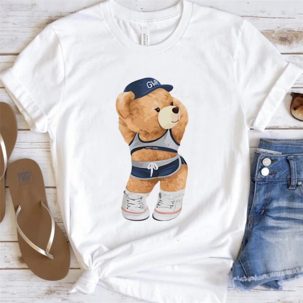Bear in Workout Gear Women's Printed Cartoon Basic T-Shirt Short Sleeve Top Fashionable Summer Casual Cute Women's Clothing