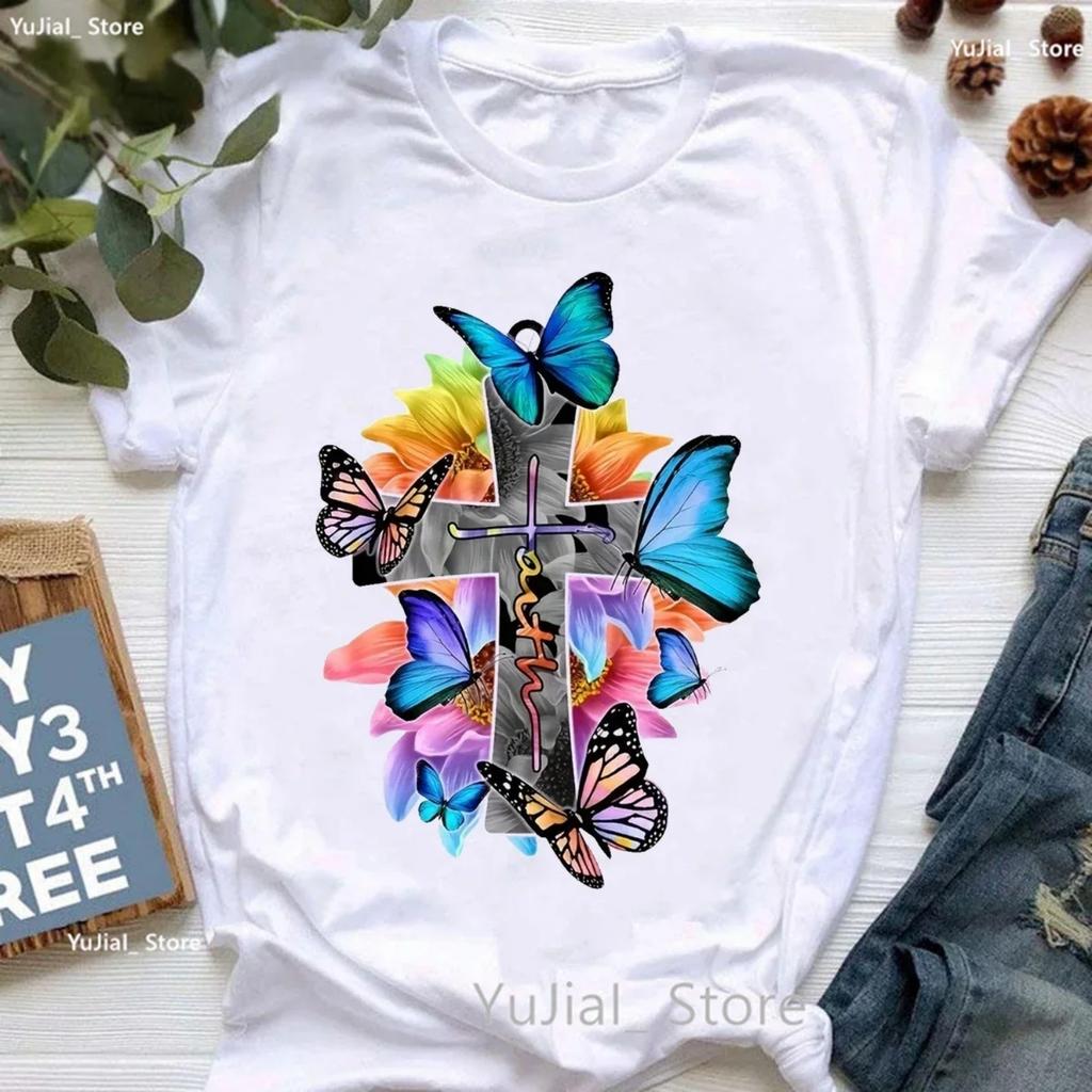 Faith Jesus Print T Shirt Women'S Clothing Beautiful Butterfly Flowers Tshirt Girls Summer Fashion Tops Tee Shirt Femme Tops