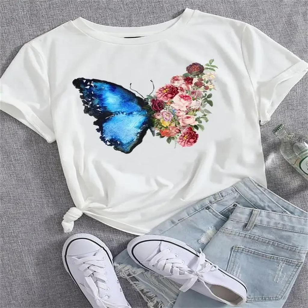 Fashion Casual Tee Women Top Short Sleeve Printed T Shirt Watercolor Butterfly 90s Clothing Female Clothes Graphic T-shirts