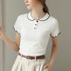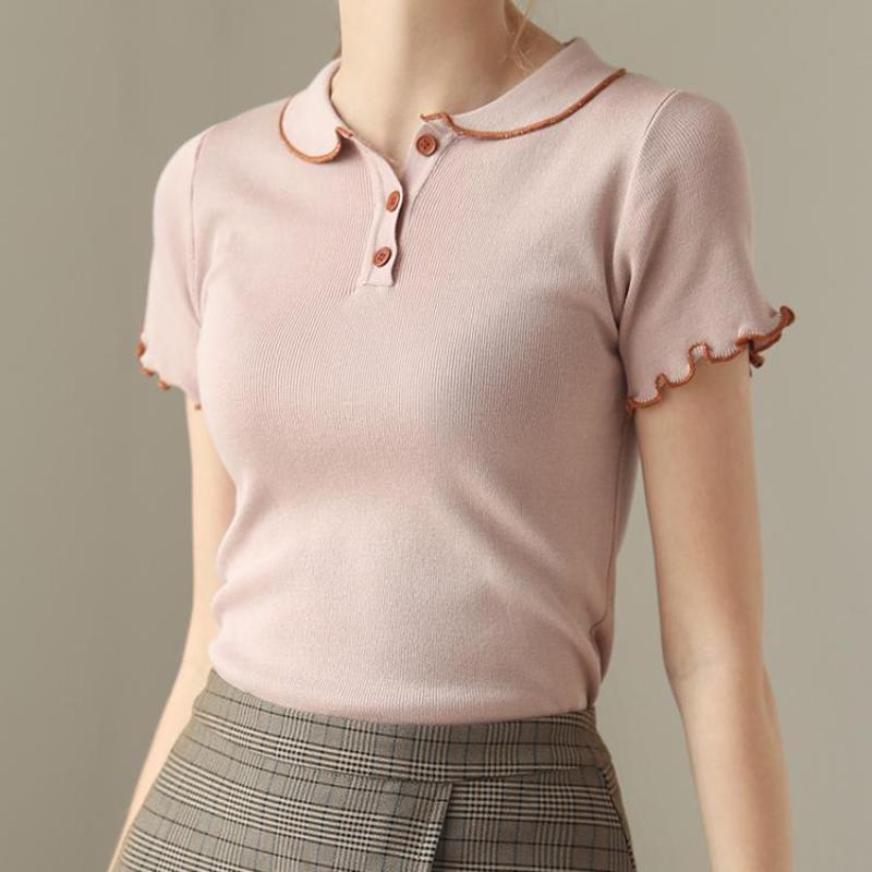 Tricou simplu cu guler polo, mânecă scurtă, culoare contrastantă, croială slim fit, tricotat din mătase de gheață, top nou cu guler pătrat pentru femei, vară