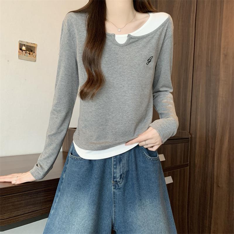 Two-piece Contrasting-color Long-sleeved T-shirts for Autumn and Winter, Women's Base Layer Tops with High-end Design Sense