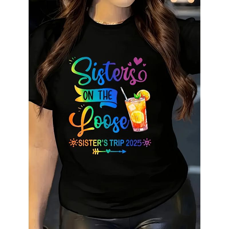 European sizes Women'S Graphic Print T-Shirt - "Sisters on the Loose" Design, Casual Crew Neck Short Sleeve Top, Vibrant Summer & Spring Tee